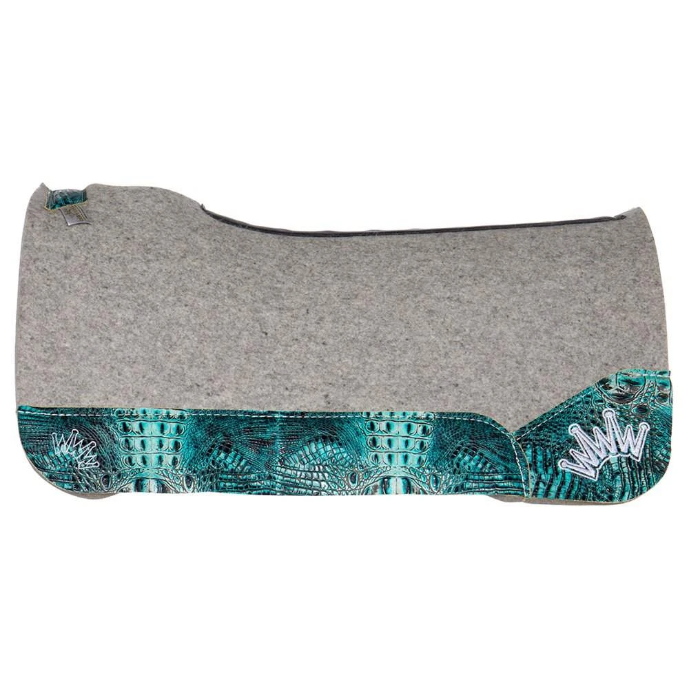 Best Ever Kush 1 Inch Felt Saddle Pad is constructed out of Best Ever’s premium Kush wool felt that features fashionable embossed turquoise crocodile wear leathers. The wear leathers really make a statement in the competition pen and highly desired by breakaway ropers and barrel racers! This pad measures 1″x32″x32″. The product number for this saddle pad is KUSH-1-STC. #ridewiththebest