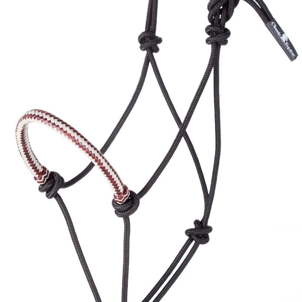 This Classic Equine Braided Rawhide Noseband Rope Halter comes with an 8ft attached lead rope. It is constructed out of durable nylon that is long lasting and UV resistant. This is one of the most popular rope halters on the market and have a wide variety of rope noseband color combinations! HALTERRRN