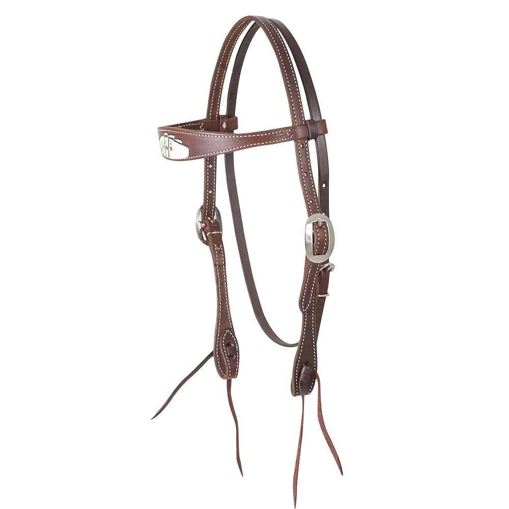 This knockout browband headstall from Martin Saddlery is constructed of premium chocolate skirting leather and features a painted card suit stamp. Cart buckles and bit ties.