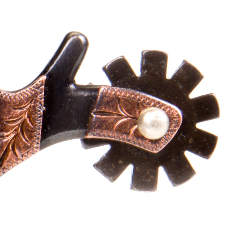 This is a spur designed by our team here at NRS. It features a 1″ band, 1 1/2″ shank, a 10 point rowel, and beautiful Copper Bar accents.