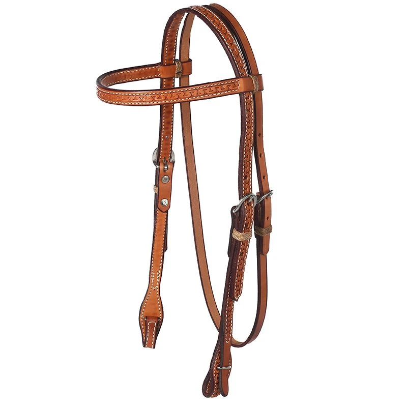This is a simple, yet attractive, browband headstall. It is chestnut leather that has been moderately to heavily oiled. It has braided rawhide keepers on the cheeks and quick change bit ends. It is stamped with a running W design.