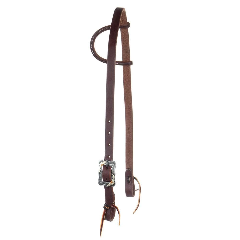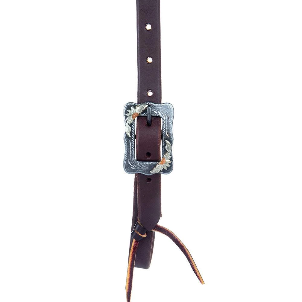 Single-ply 12 oz plus harness leather single adjustment single ear headstall. Heavy oil with tie cheeks. Buckle holes are oval for easy adjustment. The buckles are stainless steel with a daisy design.