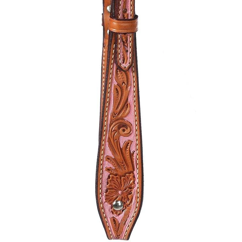 This is a browband, medium oiled headstall with intricate hand tooliing and a rose hand painted background.