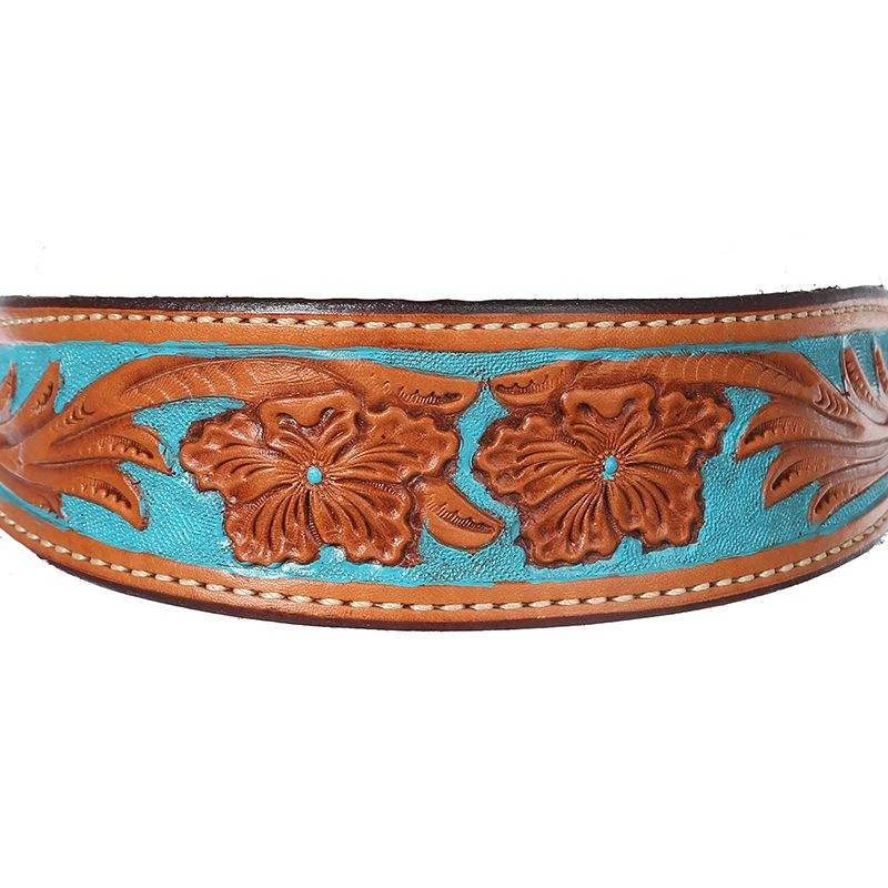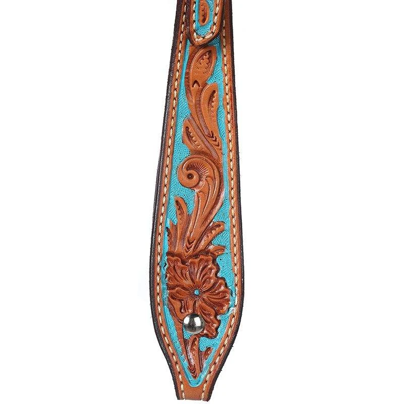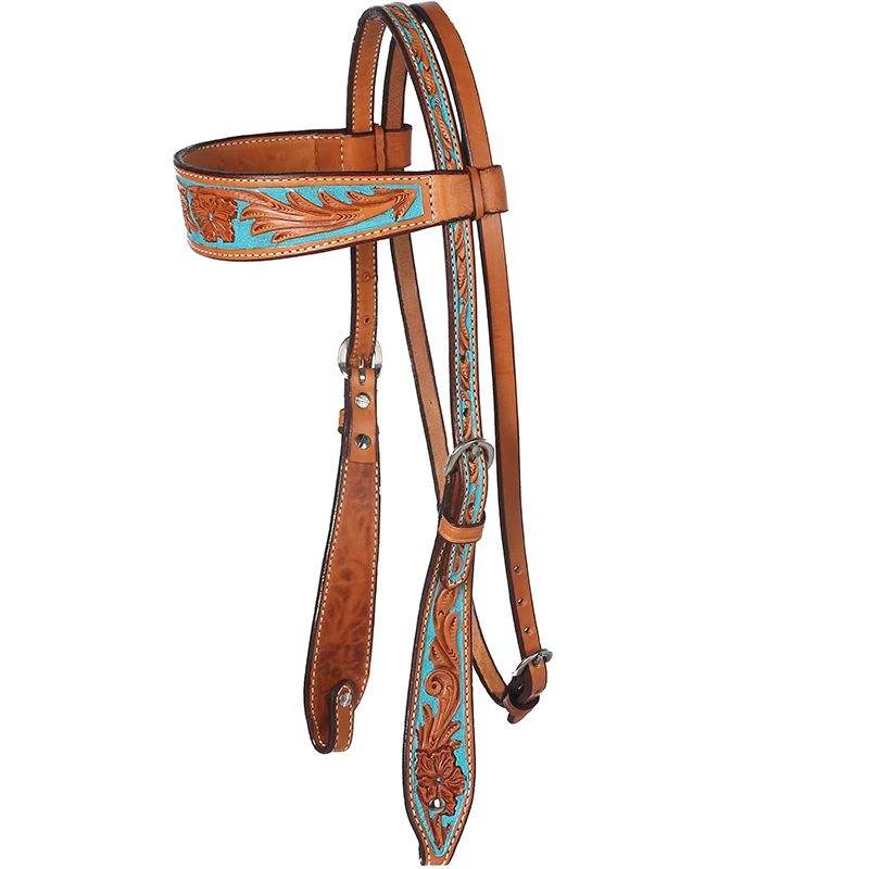 This is a browband, medium oiled headstall with intricate hand tooliing and a turquoise hand painted background.