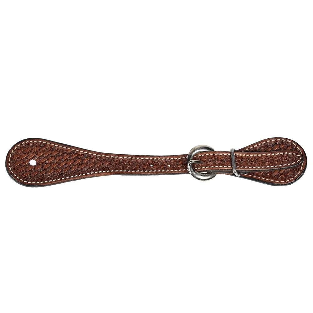 Basketweave tooled leather spur straps with 5/8” nickel plated buckle and loop.