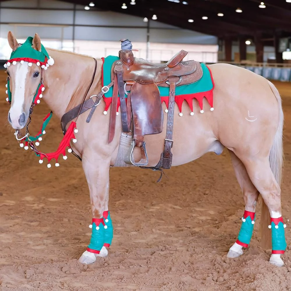 Show your holiday spirit with this 4 piece set of green and red felt with white pompoms leg wraps. Great for parades, clubs, pony rides, costume classes, and Christmas photos. One size fits most. “Quick grip” fasteners to keep securely in place. Matching items sold separately.