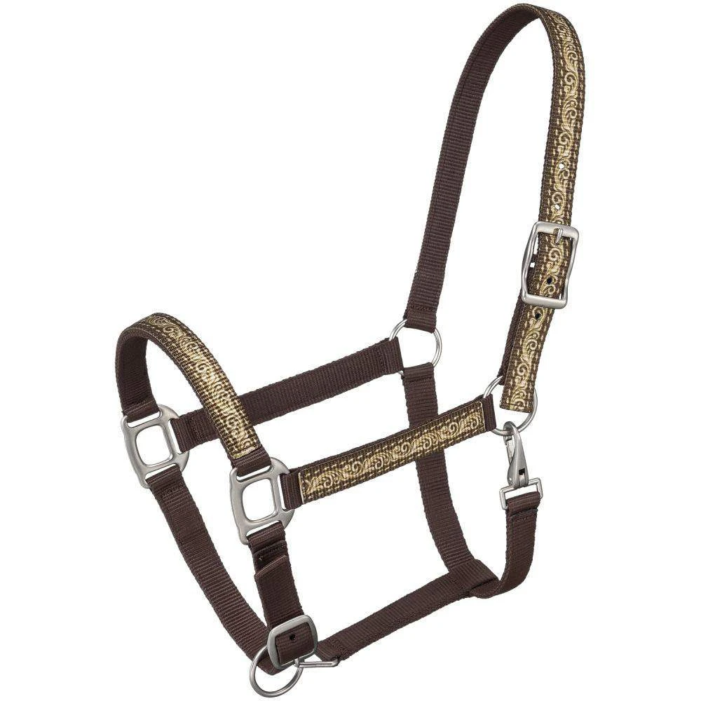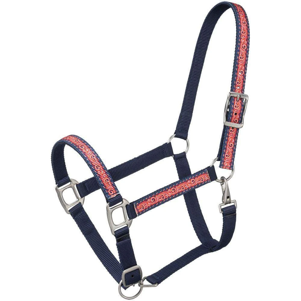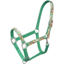 These Tough1 Patterned Nylon Halters are constructed with double ply nylon and features fun, colorful printed overlays on the nose, cheeks, and crown. Buckle adjustments at nose and crown. Cheek clip for easier on/off. Brushed nickel plated hardware. 50-6021
