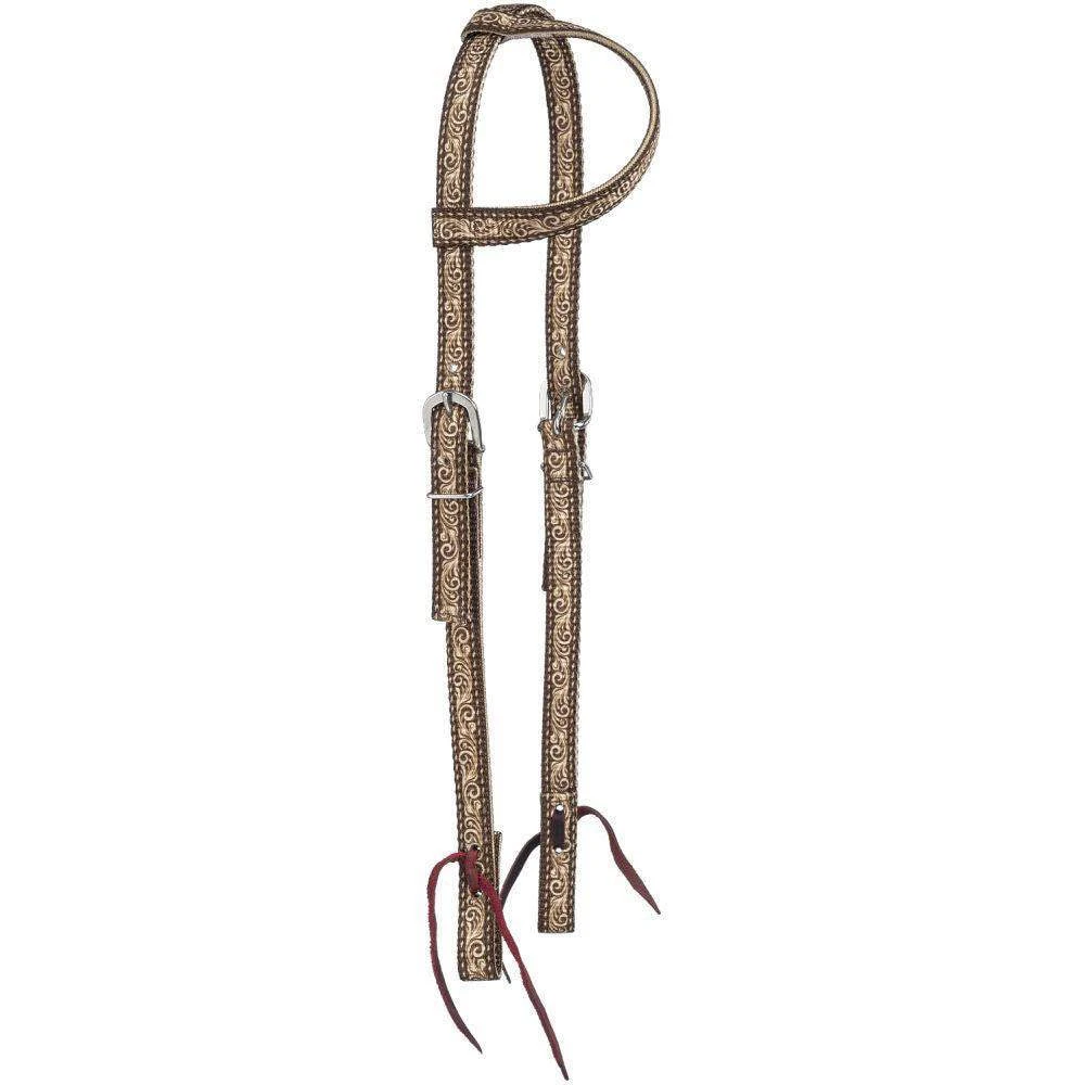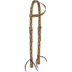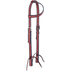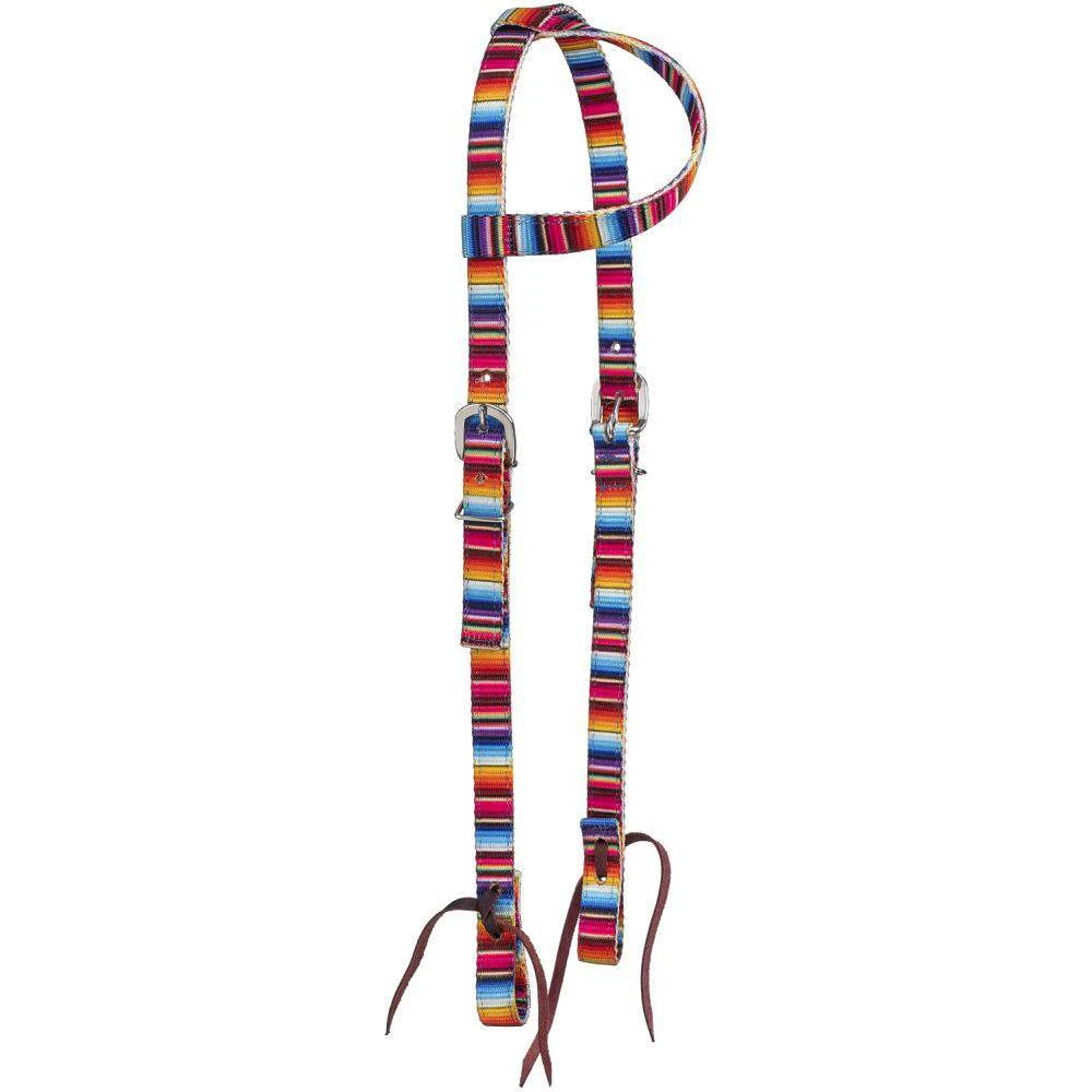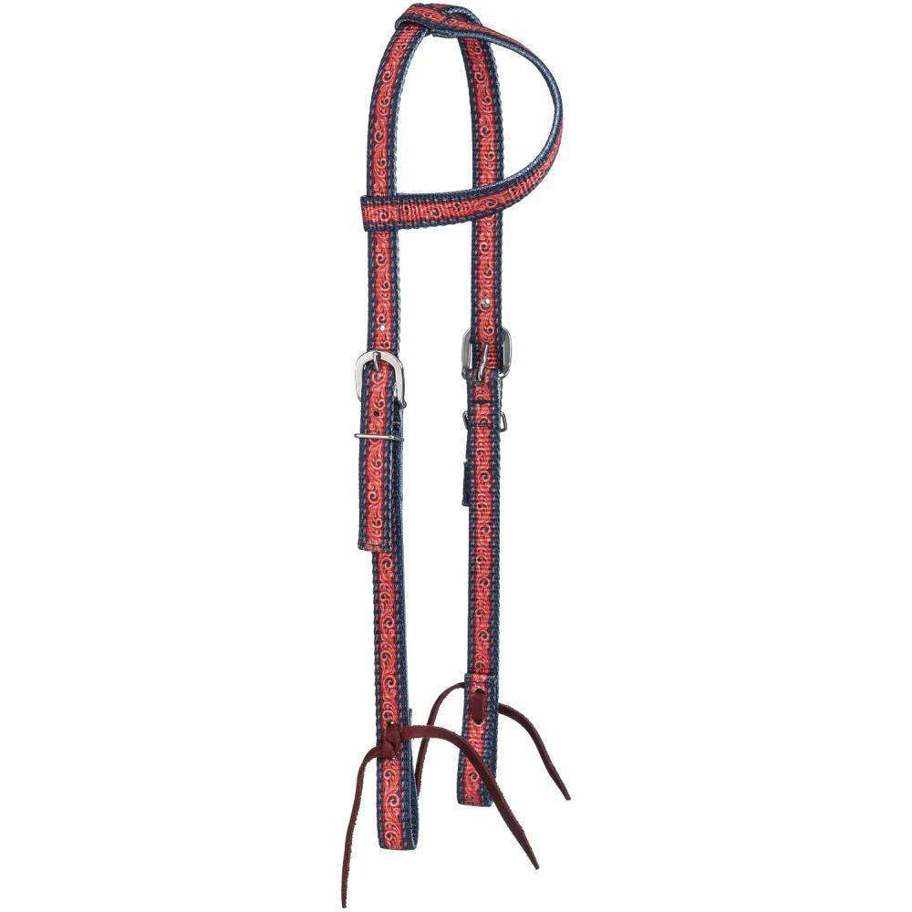 Premium Tough1 Single Ear Nylon Web Patterned Headstalls come in a variety of fashionable patterns. Constructed with double ply nylon and leather tie bit ends. These are a popular style for speed events or everyday riding. 42-9942