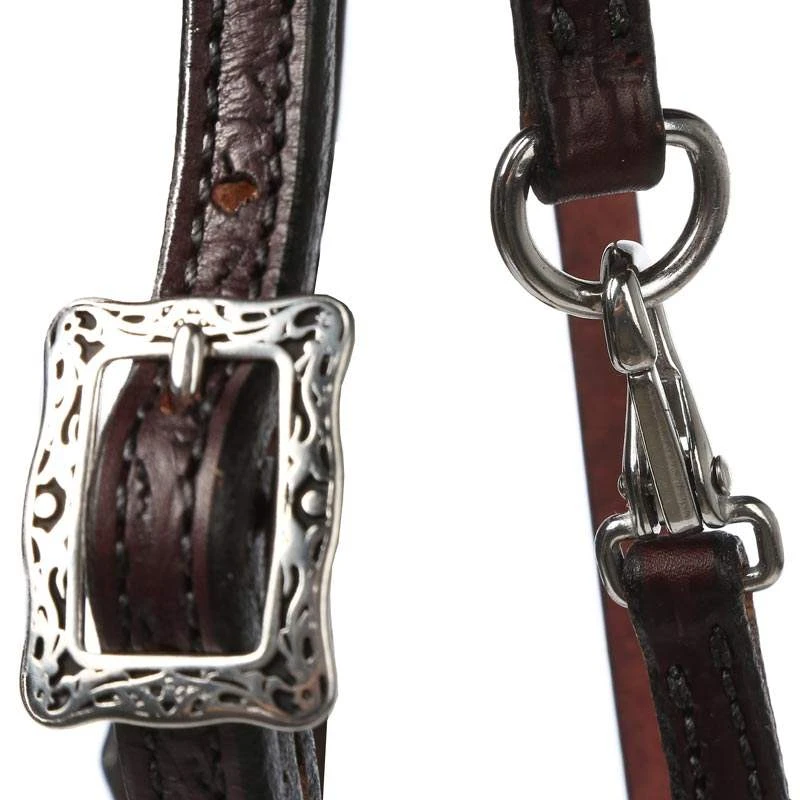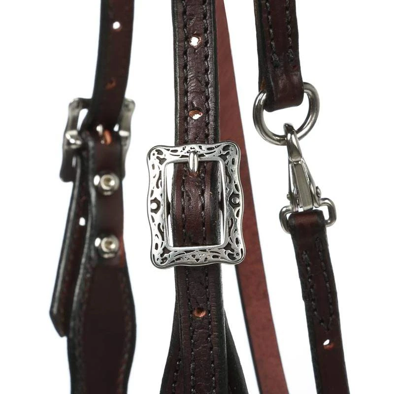 Tucker tooled Horizon tack is made of exceptional English bridle leather which is known for the luxurious softness, moisture repellent, and longevity. Stainless steel hardware is combined with black engraved accent buckles, and conchos at bit ends. This tack piece will beautifully accent your horse. The horizon tack collection was designed with comfort and convenience in mind.