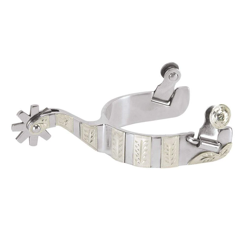 These stainless steel spurs have a 2″ shank, 1″ band, engraved German silver trim and an 8 point rowel. Men’s size.