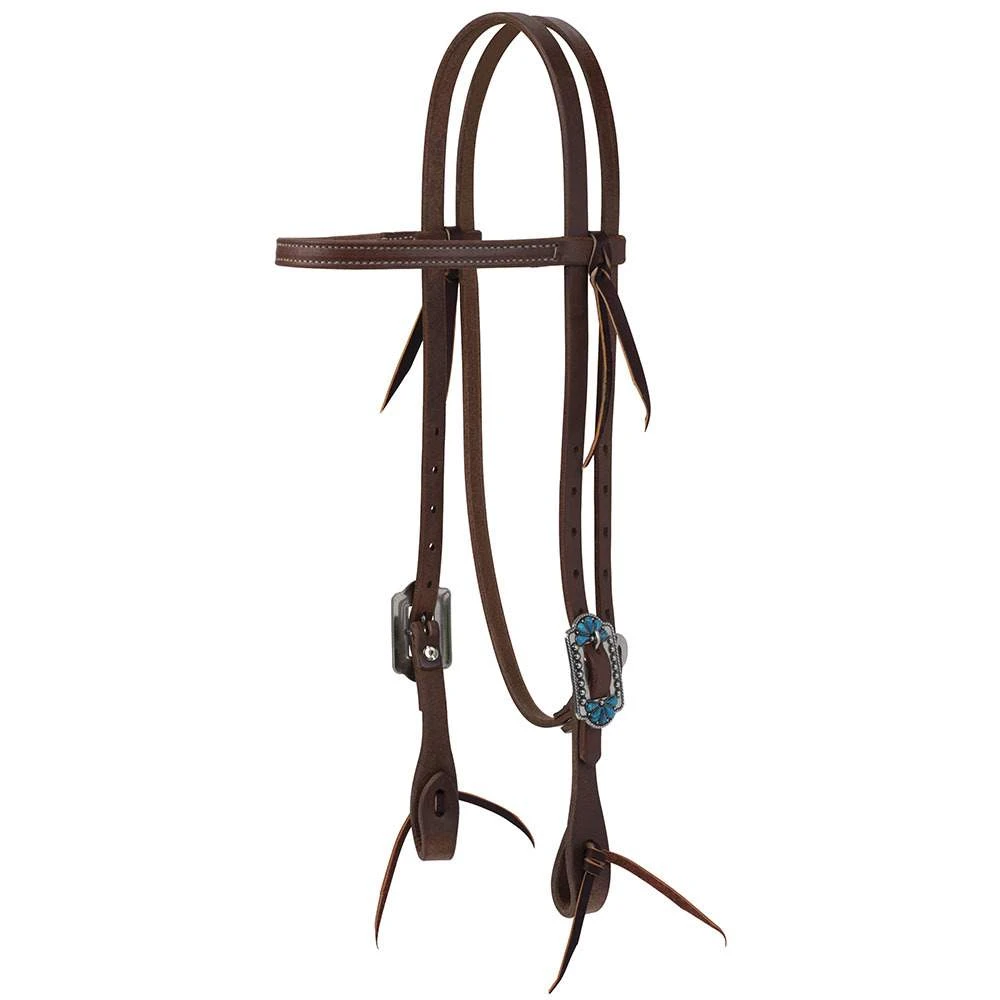 This Weaver Leather headstall is handcrafted from Hermann Oak premium russet harness leather that’s dipped in oil, dressed with saddle butter and hand rubbed for an exceptional feel. Exclusive designer hardware features antique nickel zinc die cast buckles accented with floral turquoise stone design.